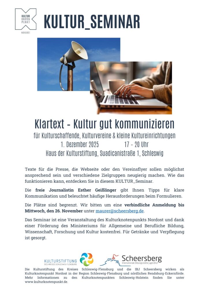 Um eine verbindliche Anmeldung unter claudia.koch@kultur-schleswig-flensburg.de oder maurer@scheersberg.de wird bis zum 19. April gebeten.