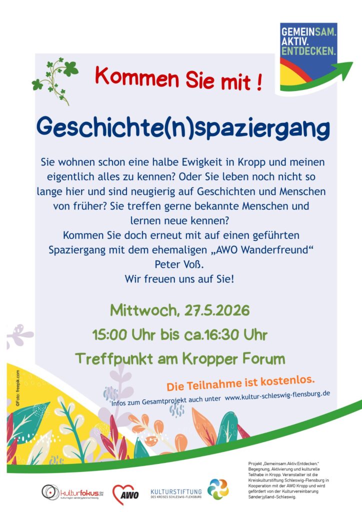 Die Kulturstiftung Schleswig-Flensburg startete 2025 das Projekt Gemeinsam.Aktiv.Entdecken mit einer Veranstaltungsreihe in Kropp für Seniorinnen und Seniorenund alle anderen Interessierten, in Kooperation mit der AWO Kropp.